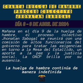 Debido a diferentes incumplimientos por parte del gobierno nacional y de la oficina del alto comisionado para la paz en relación a la “Mesa del estallido un aporte para la paz y la justicia social” instalada en la cárcel de Palmira, el Proceso Colectivo Jhonatan Sabogal anuncia que iniciará una cuarta huelga de hambre el próximo 1 de abril de 2024.